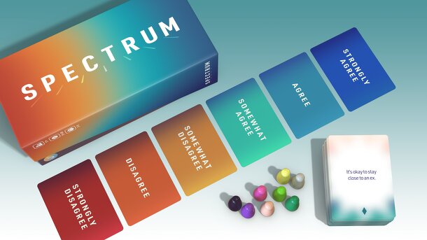 Spectrum is a social deduction party card game. Win the game by best discerning where players stand within a spectrum of opinions ranging from Strongly Agree to Strongly Disagree, on topics ranging from the silly to the serious! Each turn, a player will choose a Prompt from their hand of cards, such as "It's okay to be close to your ex," and play it...