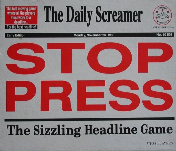 An Australian game produced in the 1980s, Stop press involves rolling a colored die to determine one fo three them,e decks from which to draw a theme card (Good News/Bad News, Scandal or Crime). On the card is a short apocryphal theme like "celebrity found dead in strange circumstances". Each player has a set of words on cardboard chits and is given one of...