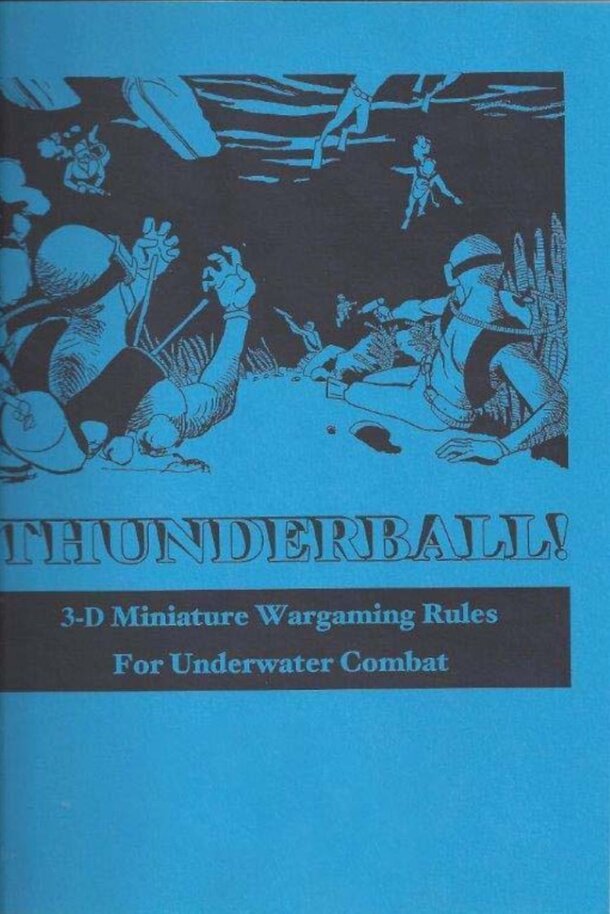 THUNDERBALL! Miniature rules for underwater combat Exciting 3-D underwater battles with spear guns, knives, and sharks. Includes rules for three different levels of play. The Basic Rules introduce new players to the game for quick and easy mayhem. The Advanced Rules bring in many tactical options with a wide range of troop qualities, armored scuba suits...