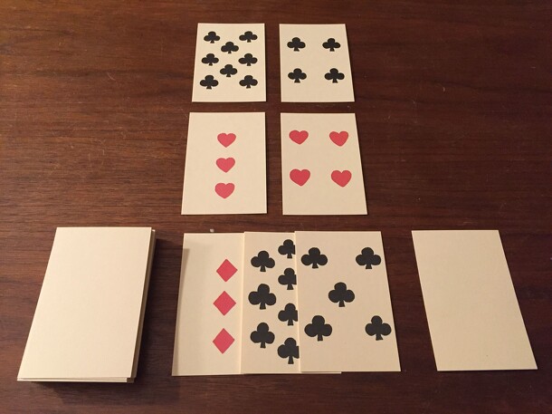 Donsol is a simple solitaire card game where you are tasked with exploring the rooms of a dungeon using a standard 54-card poker deck. It was designed by John Eternal for Train Jam 2015. Clubs, Spades, and Jokers serve as monsters, hearts as potions, and diamonds as shields. Red numbered cards possess their face value with royals and aces equaling 11....