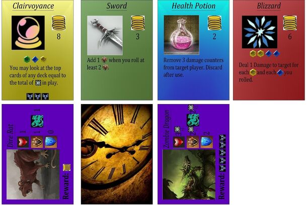 This game is played with two deck of cards in where one is the dungeon the other is the village. With a bag of dice the player must roll the dice and with the result gain certain amount of mana,cash,attack,and shields. After the rolls the player must decide to visit de village or go down in the dungeon to fight a monster (classical fantasy dingeon game yes...