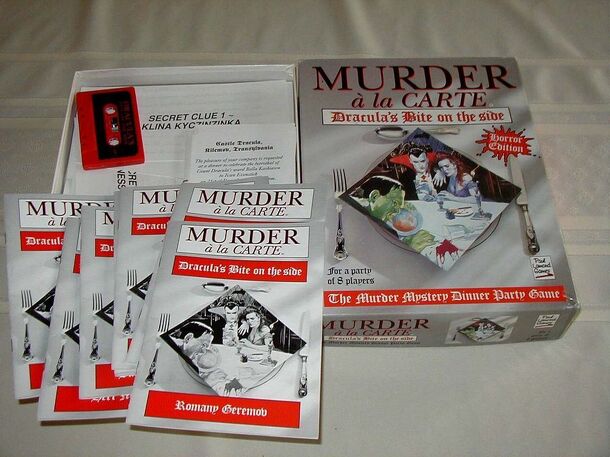 From the box: Enjoy a little murder with your dinner?... Everyone's a suspect when murder is on the menu. And with Murder à la Carte you have everything you need to serve up the perfect murder dinner party. First the invites, you choose which of your friends play which devious suspect and invite them to come along as that character. Then the shopping list...