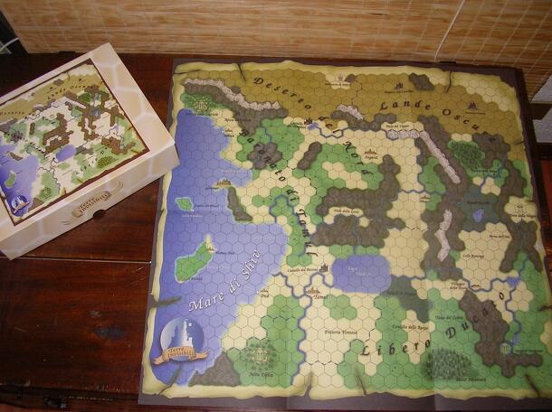 Self-producted fantasy boardgame. Every player has a character represented by a counter on the game map. Players try to increase the features (strength, agility, stamina, mind and... money) of their characters according to the classical fantasy setting (wander, have encounters, fight the monsters, take the gold). The final goal is to find and piece...