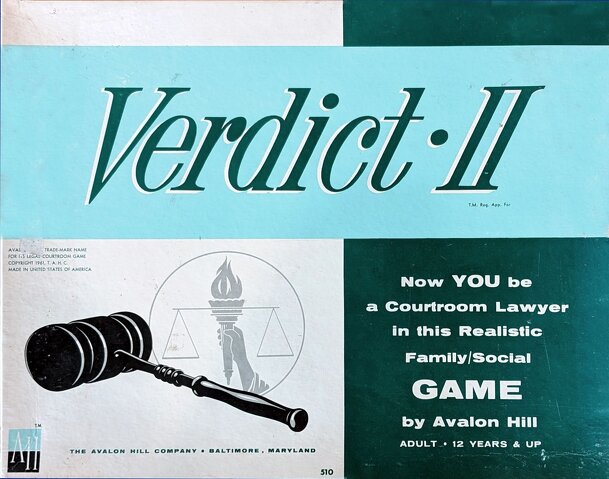 One of the original set of Avalon Hill "Adult Games" which include Gettysburg, Tactics II, U-Boat & Dispatcher. Verdict is an authentic all-skill game in which two or more players conduct a criminal court trial based upon the rules of evidence. One player takes the part of the prosecutor and the other player the part of the defense counsel. There are 15...