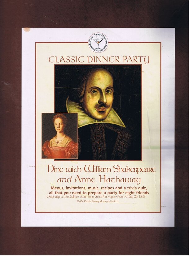 A dinner party for 8 people intending to recreate a setting similar to one in Shakespeare's time. This only slightly qualifies as a game as the box includes a small set of trivia cards to play with during the dinner. It is intended more as a fun dinner with a theme. From the box: "This box contains the ingredients for a unique and historic dining...