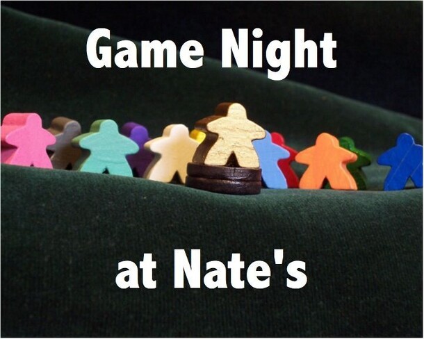 (This game was a one-of-a-kind gift for Nate (Cavedog_pdx on BGG) designed and assembled by his regular gaming group. He had no idea what 14 of his friends were up to!) From the English rules: It’s Game Night at Nate’s! As the regulars trickle in, the haggling begins. What to play? In this highly realistic simulation, you earn points by having fun. Play...