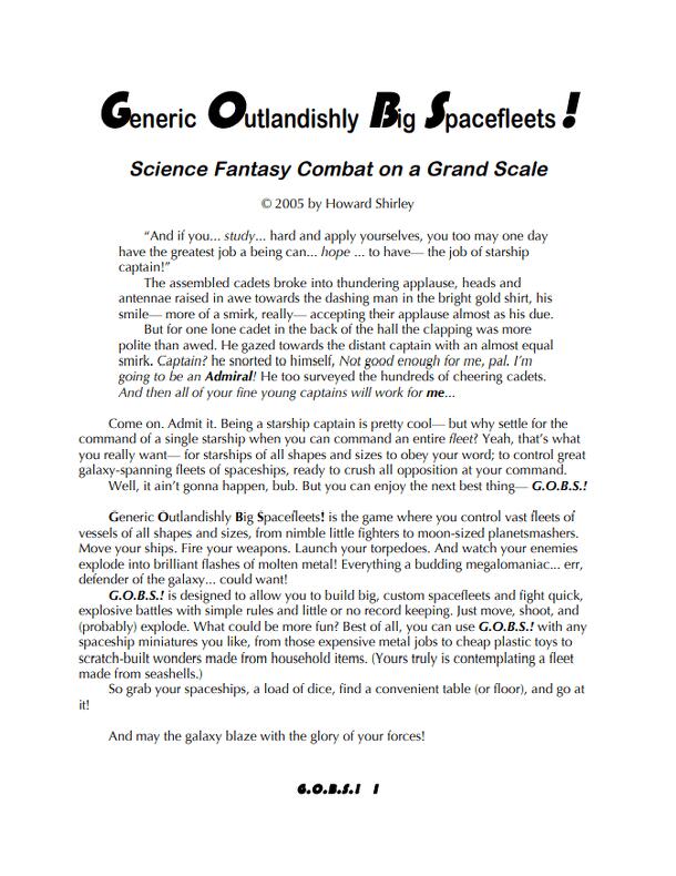 From the introduction: "Generic Outlandishly Big Spacefleets! is the game where you control vast fleets of vessels of all shapes and sizes, from nimble little fighters to moon-sized planetsmashers. Move your ships. Fire your weapons. Launch your torpedoes. And watch your enemies explode into brilliant flashes of molten metal! Everything a budding...
