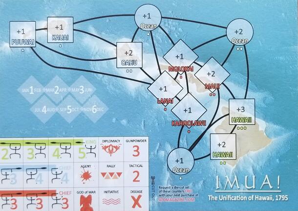 In 1795, the Hawaiian Islands were divided amongst competing Ali'l, or high chiefs. A civil war (known as the "Unification of Hawaii") took place for control of the entire chain. This game pits Hawaiian King Kamehameha I against two smaller kingdoms, Maui and Oahu. The active opposing sides are the Hawaiian Player (HP) vs. the Oahu Player (OP). Maui units...