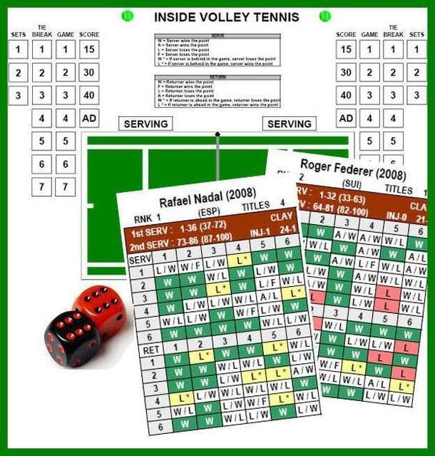 Welcome to the world of Inside Volley Tennis (IVT) ! IVT is a dice driven, point by point, yet quick playing game. Each player has a 6x6 matrix for his service game and a 6x6 matrix for service returns. Players are rated for each surface they played on. Servers are rated for Aces & double faults and these results can also be obtained from the returner's...