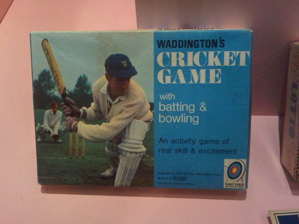 From the box: "Waddington's Cricket Game with batting and bowling. An activity game of real skill and excitement." Players can either bat or bowl. Although only two players can participate others can act as onlookers or wait their turn to bat and bowl in teams. Waddington's Cricket Game recreates a cricket pitch on your table or floor. There is a plastic...