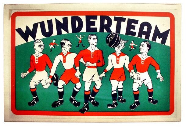 Two or four player soccer game using metal miniatures; players each have 1 field player and 1 goalie, using a ball that position determines the possession/active player. On a board with checkerboard patterns different areas (dark & light) determine who's next to kick (dark or light team). The player puts the field kicker next to the ball and releases its...