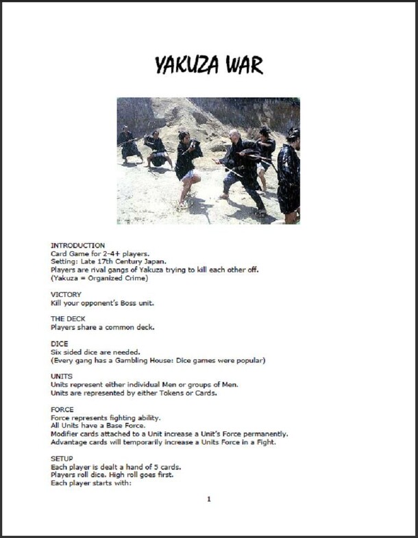 Card game for 2 to 4 players. CCG type Mechanics. Set in 17th Century Japan. Each player controls a Yakuza (organized crime) group. Players are trying to kill off each others Boss. Players recruit Samurai, Ronin, Bushi, Ninja, and others to help them fight. Fight cards determine how many Units can fight in a battle. Battles are resolved by a combination of...