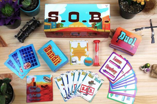 S.O.B. is a dynamic card game filled with Bandits, Duels, and a Few Sons of Bandits. Players take turns acting out cards from the Bandit deck. Guess the word, and earn the Bandit. But beware....some of the outlaws are S.O.B.s! Strategically Duel opponents to steal Bandits or become the new Sheriff in town. Goal is to collect the most Bandits before time...