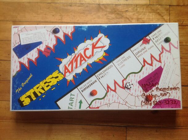 The object of STRESS ATTACK is to be the first to complete four stages of stress (childhood stress, school stress, job stress, and lovelife stress) in order. Usually, players roll and move around a board, taking various kinds of cards, losing turns, and so on. When a player lands on an appropriate space on the board, she can enter the appropriate subgame...