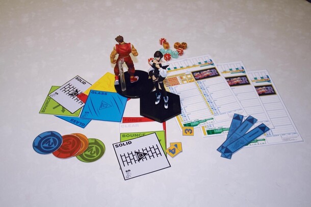 Super Gachapon Fighter is a tabletop/miniatures fighting game ruleset designed for 2-4 players. Players create their own personalized fighter (using any figures or miniatures you have at hand) and take to the streets for one on one or team based combat. Make any tabletop a arena to stage your bouts. Use fireballs, combos or grapples to pound your opponent...