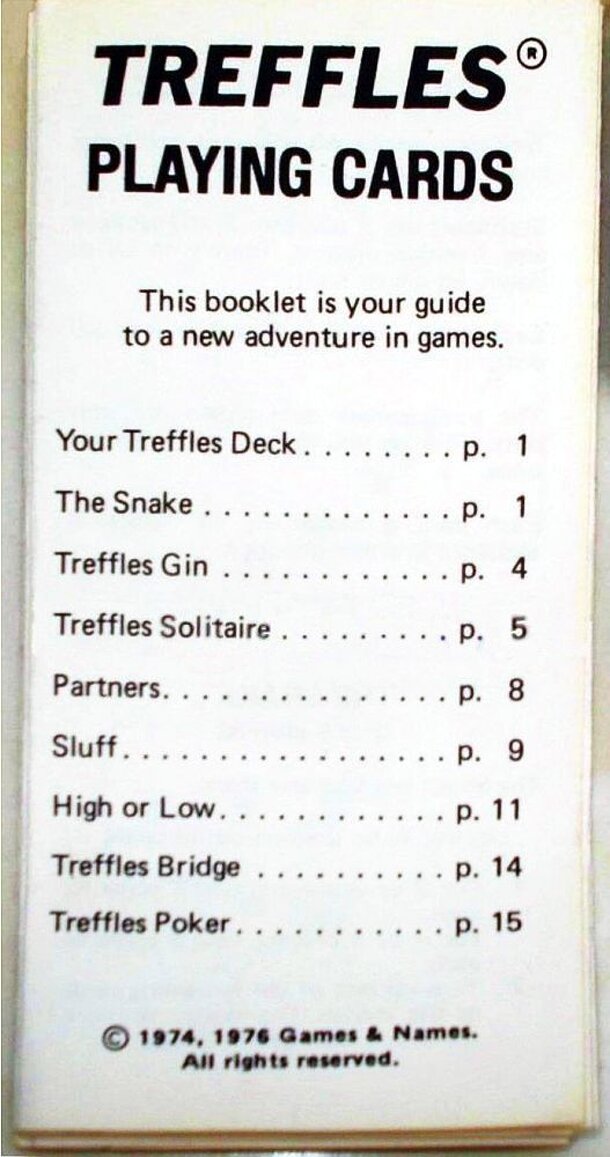 The Treffles deck is made up of 40 cards, each divided into three segments containing zero to three dots. Five games are described in the rules: The Snake - a matching game Treffles Gin - a Gin Rummy adaptation Sluff - a "Spite and Malice" style matching game High or Low - a trick-taking game Partners - a Concentration/Memory game Re-implemented by: Space...