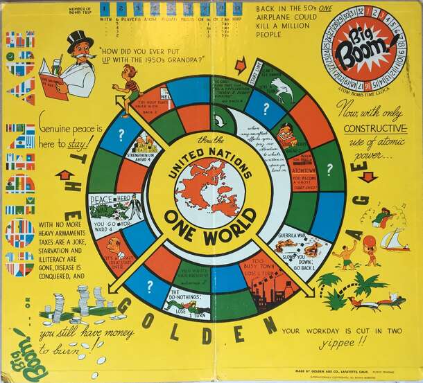 This Cold War game seems to have been propaganda for the brand-new United Nations. It's a roll-and-move affair, but with one player playing the Atom Bomb and moving around a doomsday-clock circle while the other 1-5 players move Nation pieces cooperatively on a spiral toward the goal of a single world government through the UN. The components include 8...