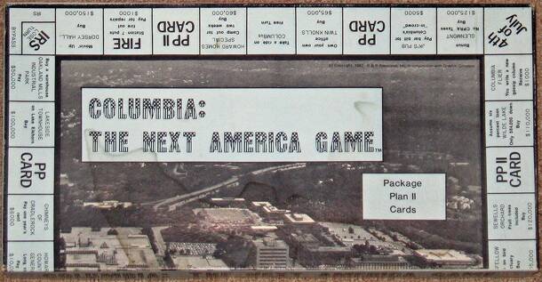 This appears to be a promotional item devised at the request of the Rouse Company. Centered on the planned community in Columbia, MD, this game offers players the opportunity, "to become a developer in the NEXT AMERICA, COLUMBIA." Players must accumulate wealth and property in order to win. As with Monopoly, upon which this game is strongly based...