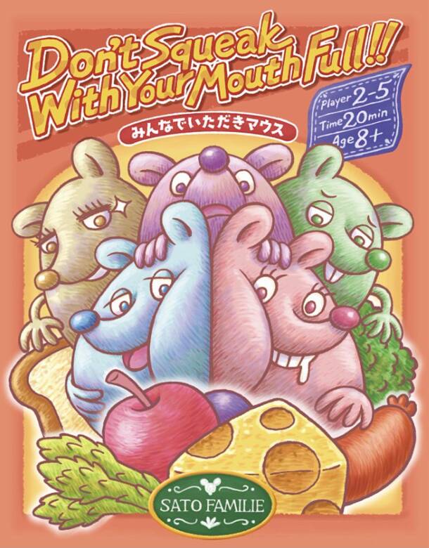みんなでいただきマウス (Min'na de itadakimausu) Don't Squeak With Your Mouth Full!! is a card game from Japan. You’re a peckish family of mice, fighting over the plates of food in front of you! You’ll have to chews your food wisely, because if you take too much you’ll be forced to share. Will you be crafty enough to get the most food? publisher's summary The deck has...