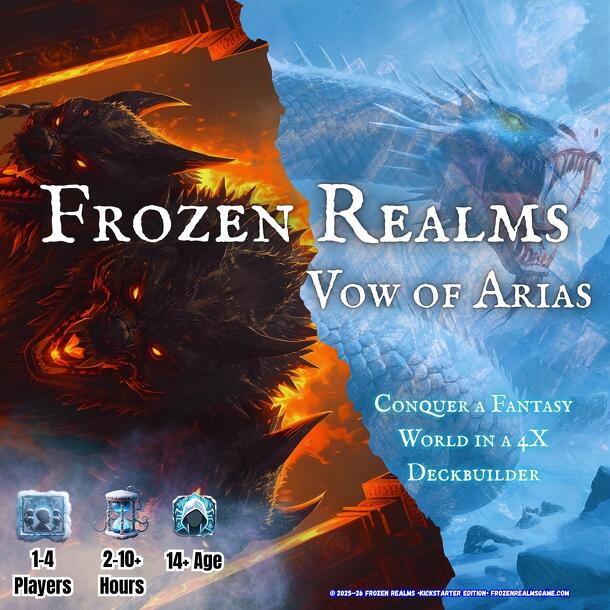 Frozen Realms is a 4X deckbuilding tabletop game set in a fantasy world. Players choose a race and faction, build their decks, recruit units, and expand across a modular campaign map. The game combines strategic map control with turn-based battles resolved on a separate battle map. Each turn, players receive resources from their provinces and structures...