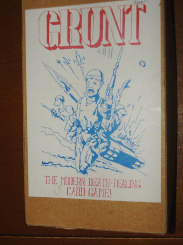 Grunt is a warfare card game using a board to depict 6 combat areas where Grunts (infantry) engage in combat. The 6 combat areas depicted on the board (Town, Woods, Ruins, Hills, Swamp, and Fields) affect combat potential dependng on equipment and attack types used. Players take turn drawing and playing cards. Types of cards are: Black (Action) cards, Red...