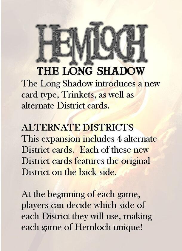 The Long Shadow promo expansion for Hemloch includes: 4 alternate ability Location cards - These 4 location cards will also include the original Location cards on the back side, making it easy for you to mix and match which version of the Locations you want to use for your Hemloch games. 5 Scepter cards - The Scepters are a new item that can be acquired by...