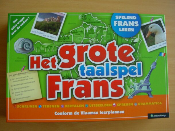 Het Grote Taalspel Frans ('The big language-learning game French') is a boardgame for Dutch-speaking children and adults, who wants to learn French. The 20-sided dice decides to which region you have to move your pawn. You have to choose a mission in this region. There are 6 missions: figuring - drawing - writing - quiz - translating - speaking. If you're...