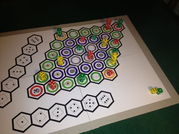 Players place dice on the hex board to form towers. Dice rolls are used to determine the coordinates where dice can be placed. Dice can be placed either on a vacant hexes (gaining power tokens), or to increase the height of the player’s towers, or used to reduce an opponent’s tower. Power tokens can be used to adjust dice throws or directly alter towers....
