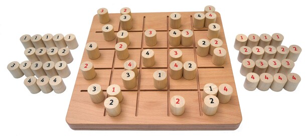 KALKÜL (Calculus) features a 5x5 wooden playing area, and each player has their own set of tokens numbered 1-4, which are placed in separate bags. Each area in the game board can hold up to four tokens, and players take turns drawing one of their tokens from their bag and placing it in one of the available locations. The game ends once all the spaces are...