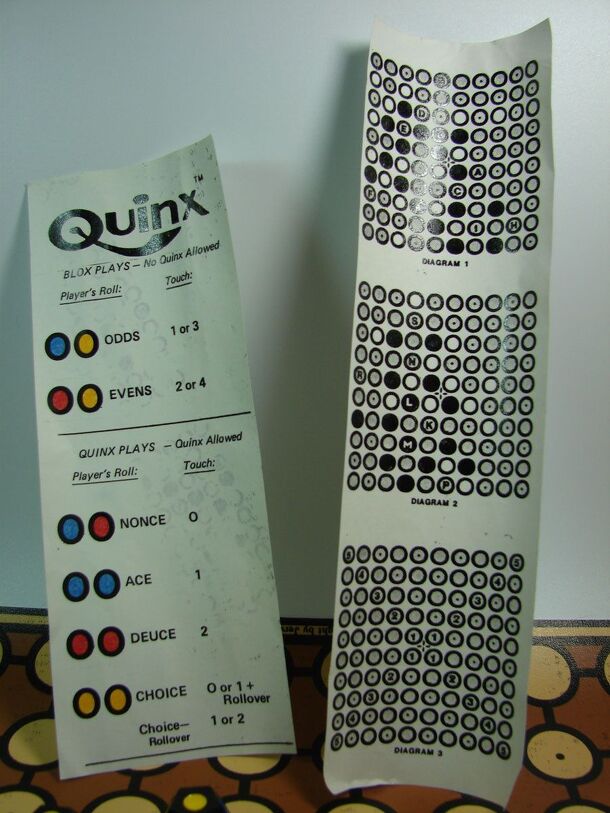 An abstract strategy game from designer Joli Kansil. Players roll two dodeca, 12-sided dice colored with 3 different spots, to determine how they may place a piece on the 10×10 board. Players can play only on their own color, but the dice roll determines how many friendly or enemy pieces the new piece may be adjacent to. The goal is to form 5 quinx. A...