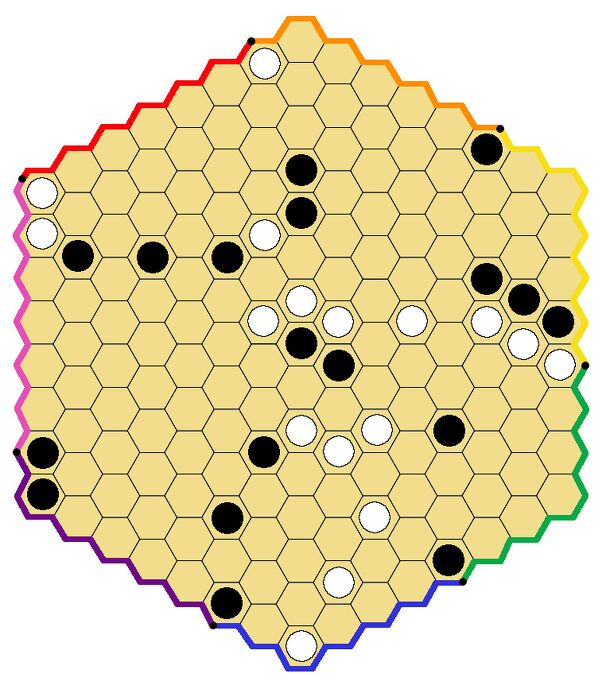 Side stitch is played on board tessellated with hexagonal cells and possessing an odd numbered of sides. The goal is to create a group of stones that touches more sides than your opponent. (Note that on game boards that have colored borders, each distinct color counts as a distinct "side.") RulesOn each turn, a player plays a single stone of his/her color...