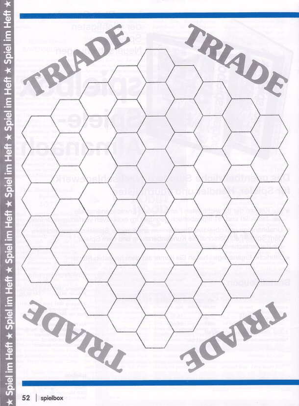 Triade is an abstract game that is played on a board with 61 hexagonal spaces. Each player starts with 31 pawns of a different color (e. g., one player will be white and the other will be black). On their turn, a player places a pawn on a empty space on the board. A player may continue to place pawns on the empty spaces that are neighbors to at least three...