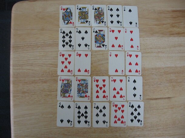 The game uses 24 cards from a standard card deck: one red suit and one black suit, minus aces and jokers. These are shuffled and dealt face-up into a 5x5 grid, the central space being left open. One player uses black, the other red. Turns are alternate. The goal is to capture an opponent's cards using one of yours of lower rank, until you have the highest...