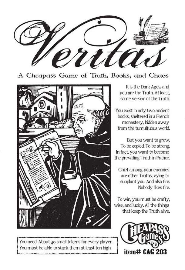 Game description from the publisher: Veritas is a Euro-style board game about the preservation of truth in Dark Ages France. Each player represents some "truth" that's trying to be preserved for posterity by diligent book-copying monks. Players place and copy book tokens in monasteries, then pick up stacks of books and spread them around France. Each turn...