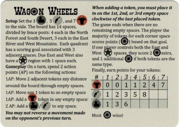 Nanodaption of Circle the Wagons. Description from the designer: Based on Circle the Wagons by Stephen Aramini, Danny Devine, and Paul Kluka, as part of the April 2017 WGKS. In the tiny wild west, you and an opponent circle your wagons around the board to score points for the cattle, guns, and forts. Each corner also has unique scoring conditions based on...