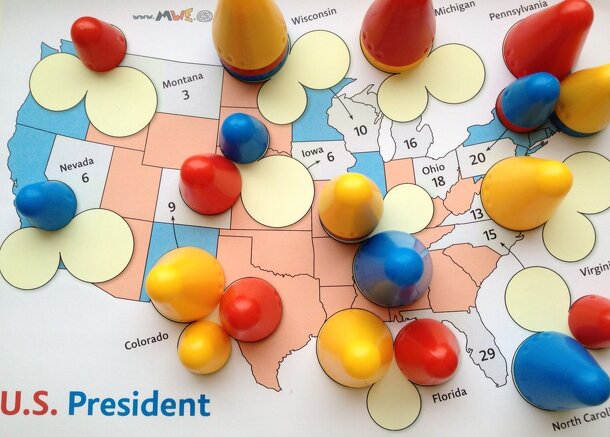 11 Swing States is is Easy-Fast-Fun game with 4 sets of Looney pyramids, map and cards. All players try to become US President investing their funds in ads in 11 Swing States. At the beginning has every player a lead in some of swing states. (Deal StateCards) In each of 12 rounds every player invest his/her funds to ads in swing states. (Select MiniCards...