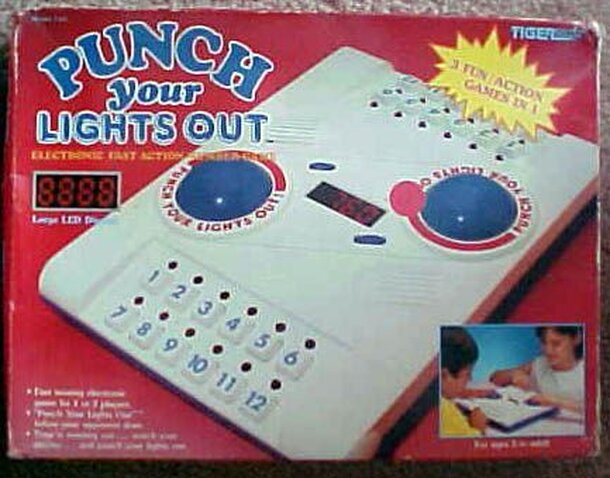 Electronic number game that includes three games: Race the clock - one or two players race against the clock independently trying to punch their lights out is 30 seconds. Smash - players compete with each other for control of the display. First to hit the plunger wins each number. Cut Throat - skill and action at its best. Just two seconds to punch your...