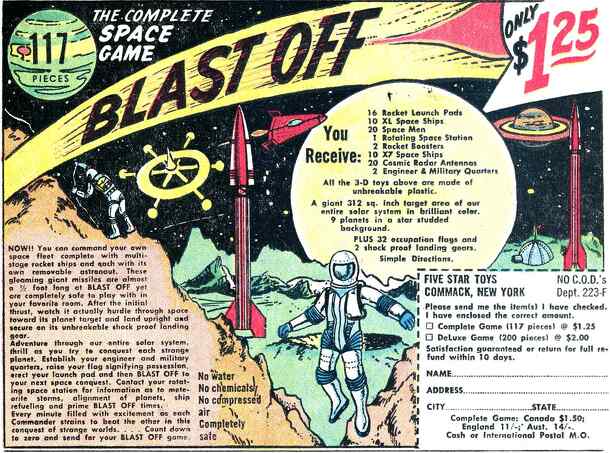 Blast Off was released by Five Star Games Company (possibly the later Helen of Toy) that was featured on many comics during the 1960's. The Blast Off Space Game does not seem to be a War Game but it appears to have included 3D Toy Soldier Spacemen. Because GIANT supplied most of the 3D figures for Helen of Toy Comic Game Sets, it seems possible that the...