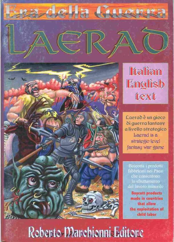 As written on the front cover: "Laerad is a strategic-level fantasy war game" Up to seven fantasy armies struggle for supremacy on the world of Laerad. The game requires 30 (!) 6-sided dice: 10 red, 10 white and 10 blue ones. The armies are identical (yes, even dwarves and elves...), but an optional rule adds some racial differences. Rules are in Italian...