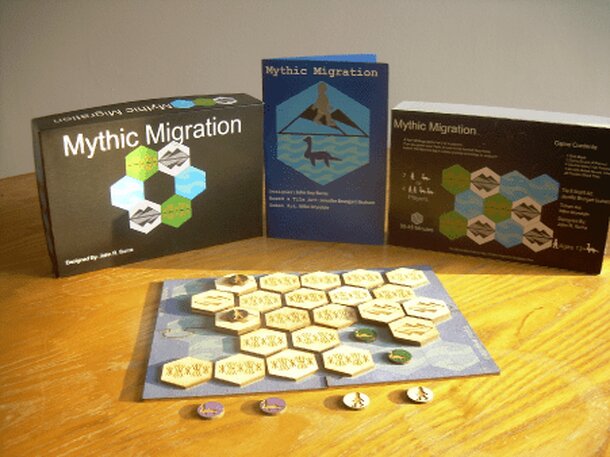 Mythic Migration is a 2 or 4 player, light strategy game. Players compete to be the first to get all their mythic creatures across the board. The terrain is the obstacle. The board begins covered as plains (1 hex tile thickness) which no one can cross. During their turn players have two action points they can divide as they wish. They can move terrain...