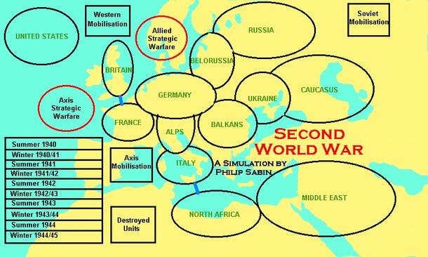 Strategic level game covering WW2 in Europe, North Africa and the Middle East. The game was created as an introduction to military simulation for students taking the conflict simulation course run by its' designer at King's College London. As such it was designed to be the simplest possible representation of the war. Game consists of -12 page rulebook...