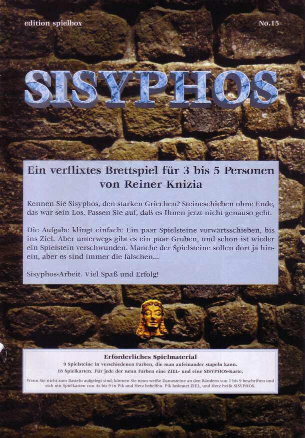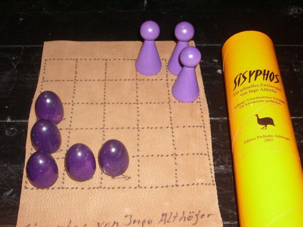 Two player game in which one player plays Sisyphos and tries to roll stones into the other player's corner, while the other player plays the mountain spirits that try to prevent Sisyphos from achieving his goal. Movement is limited to moving one square ahead in one of three directions. When a piece lands on an opponent's piece, the opponent's piece is...