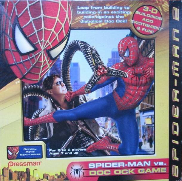 Spider-Man is up against the evil Doc Ock in this exciting new game of racing and capturing. Every player takes on the role of Spider-Man jumping onto buildings and swinging along special spaces. Get to the clock tower and attempt to rescue Jane from Doc Ock. Fail and you may go back to start. Succeed and you can race to the finish. Don't let Dock Ock...
