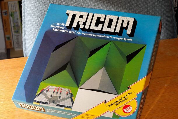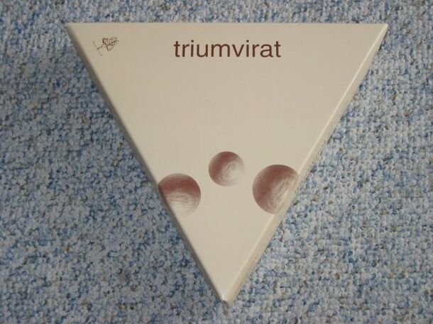 Triumvirat consists of a triangular board with 28 molds and 18 spheric marbles in three colors of three sizes. In the beginning the marbles of each color are situated like this: One large in the corner, two medium sized in the two molds in front of it and three small ones in the three molds before them. At every turn the player moves one marble, just to...