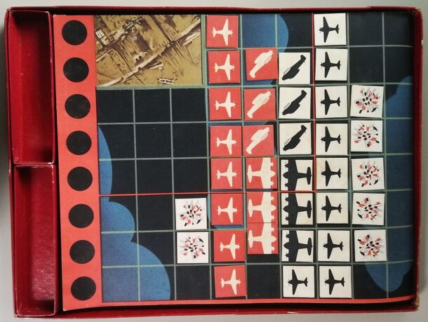 Vintage strategy board game about air battle with chess mechanic, square to square movement. Different airplanes (heavy bombers, diving bombers, fighters - each side owns 15 airplanes) and anti aircraft guns (each side owns 5 such a guns) have different actions. Player, who first capture opponents town, wins the game. Published in Brussel, Belgium. —user...