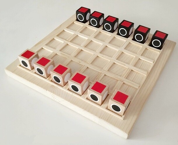 Cubix is an abstract game for 2 players. Each player has 6 cubes, the board has 36 squares. Each cube has 6 different faces. The cubes can be moved by one or two squares in any direction, by "rolling" on the board at each square. The goal is to bring one cube to the opposite row with the red square upward. Opponent's cubes can be captured when two cubes...