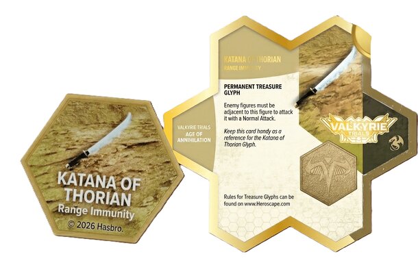 Beginning 2026 - Valkyrie Trials that players can compete and win prizes in. A promotional prize of the Katana of Thorian Treasure Glyph game piece with rules summary Army Card can be won. Unlike the figure promos, this glyph will not be purchasable as a separate item, but will be included in a future product. Katana of Thorian Every figure must be...