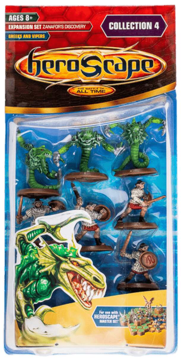 Greeks & Vipers adds 2 squads of COMMON units to Heroscape. Common means you can field as many in your army as points or starting spaces allow. Contents: Sacred Band (x1, 4 miniatures) Armoc Vipers (x1, 3 miniatures) Terrain: 2x Rock Tiles (1-hex) "The Greeks: The bonding power of the Sacred Band is awesome indeed. They give extra turns to Einar's Warlords...