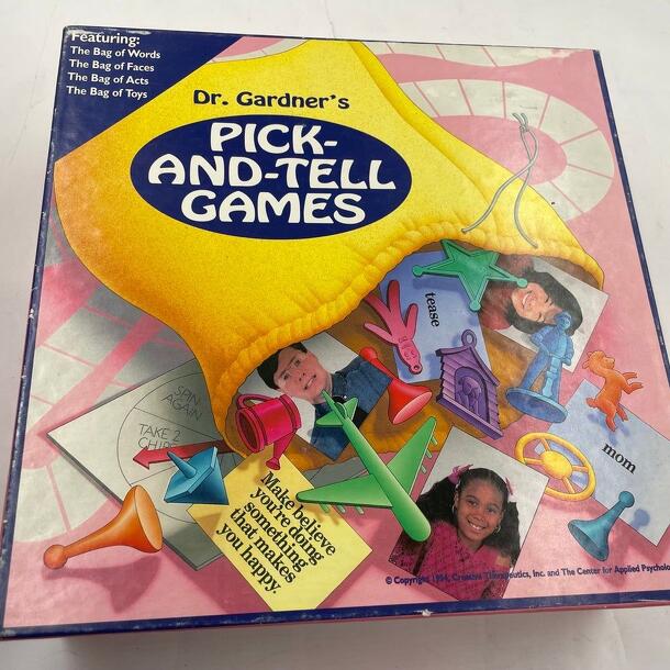 A roll-and-move game with each space indicating one of four grab-bags containing storytelling prompts (small plastic toys, face pictures, words, and descriptive actions), additional movement, or spinner use (resulting in further movement or chip award / loss). When a child lands on a "bag" space, a prompt is drawn, and varying numbers of chips are awarded...