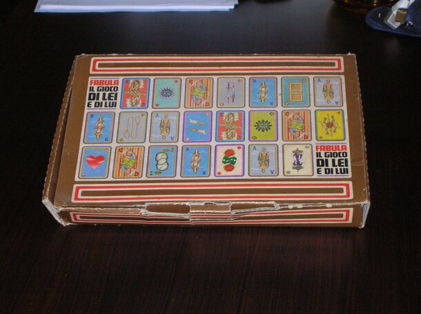 This game come with 100 cards. 50 cards are copy of 4 characters (15 of Alberto, the male protagonist, 15 of Beatrice, the female protagonist, 10 of Carlo and 10 of Carlotta (the others)). The other 50 cards are transitive and intrasitive verb cards, like "Loves", "Don't loves", "Seduces", "Kills" (transitive) and "Dies", "Is Happy", "Kill Himself"...
